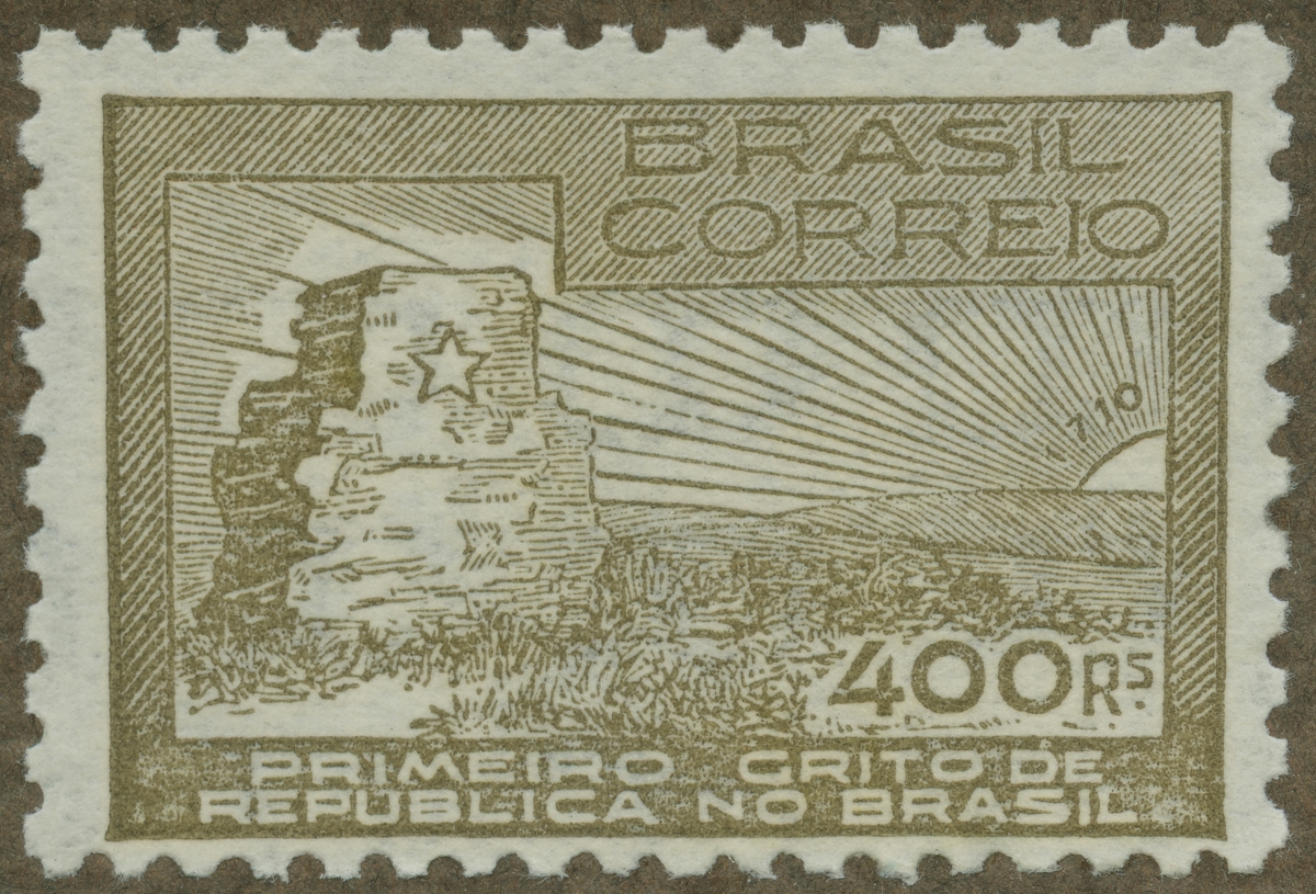 Frimärke från Brasilien, 1938. Motiv av ruinrest. "Minne av Repulikens utrotande".