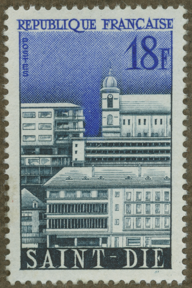 Frimärke från Frankrike, 1958. Motiv av modern fransk bebyggelse i Saint Die.