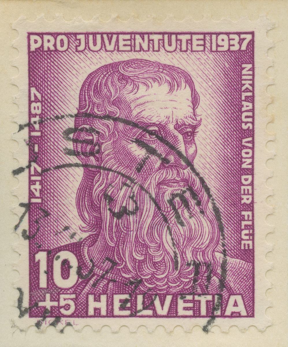 Frimärke från Schweiz, 1937. Motiv av Nikolaus von der Flüe 1417-1487. Helgon. Frihetskämpe. "450-årsminne av hans död. 1487-1937".
