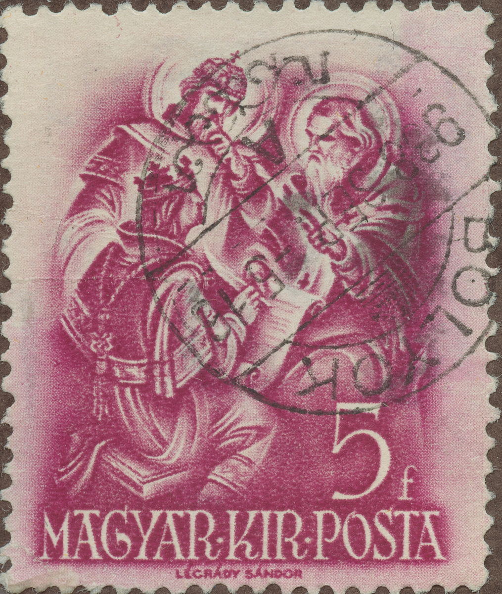 Frimärke från Ungern 1938. Motiv av S:t Gerhardt instruerar S:t Emerich i närvaro av sin fader S:t Stefan.