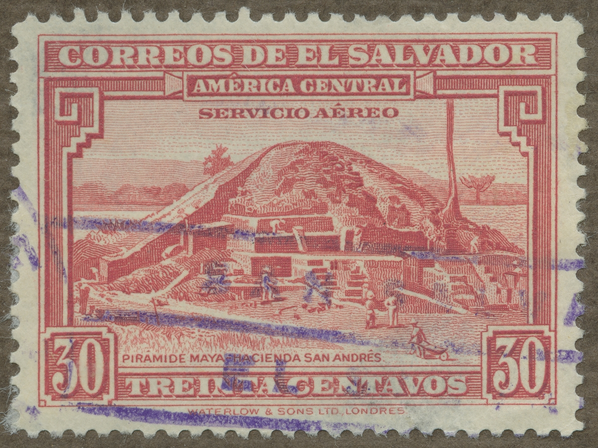 Frimärke från El Salvador, 1946. Motiv av Mayapyramiden vid Hacienda San Andrés, El Salvador.
