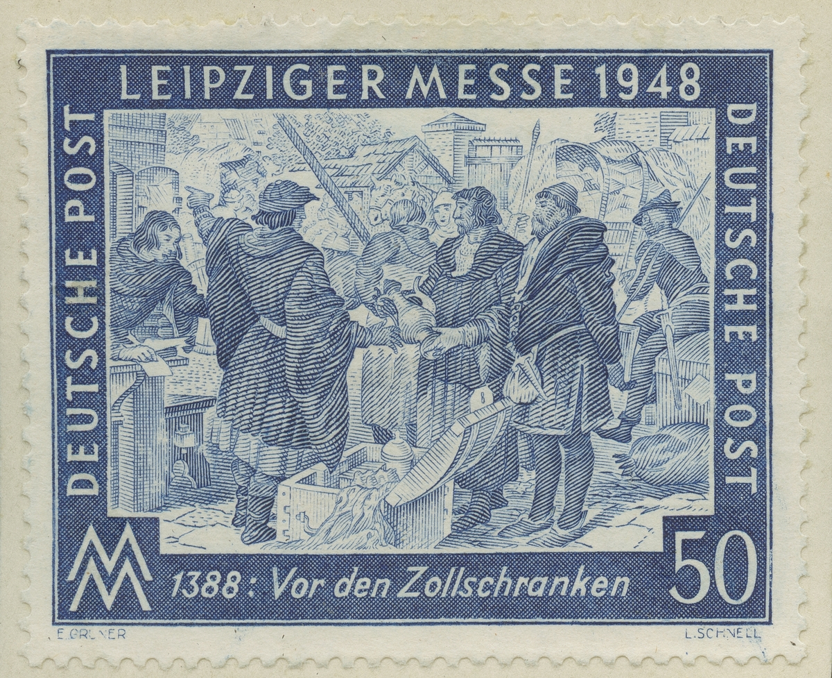 Frimärke från Tyskland, 1948. Motiv av (bild): förtullningsbesvär i Tyskland 1388. -Leipziger Mässan 1948-