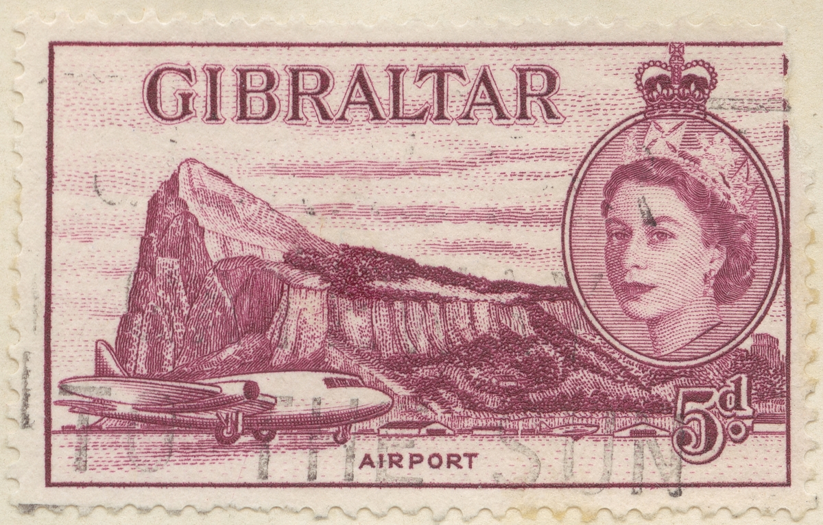 Frimärke från Gibraltar, 1953. Motiv av Flygplatsen Gibraltar -Drottning Elisabeth II-