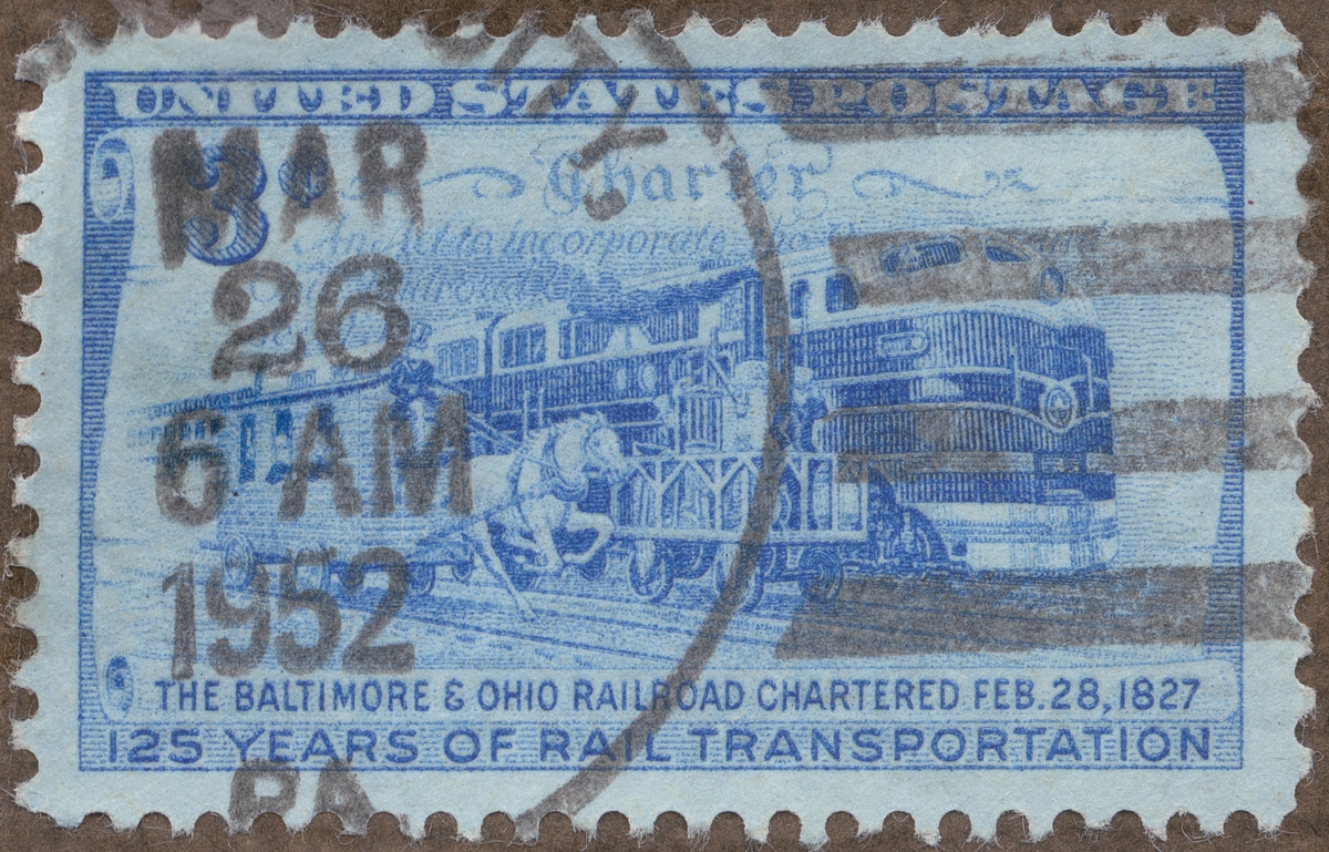 Frimärken ur Gösta Bodmans filatelistiska motivsamling, påbörjad 1950. Frimärke från U.S.A., 1952. Motiv av Hästspårvagn Lokomotiv "125 års rälstransport Baltimor - Ohio 28.2 1827"