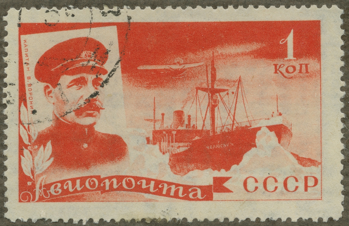 Frimärke från Ryssland, 1935. Motiv av Ryska räddningsfartyget vid Kap Tscheljuskin (t.v.): Kaptenen V. Voronin.