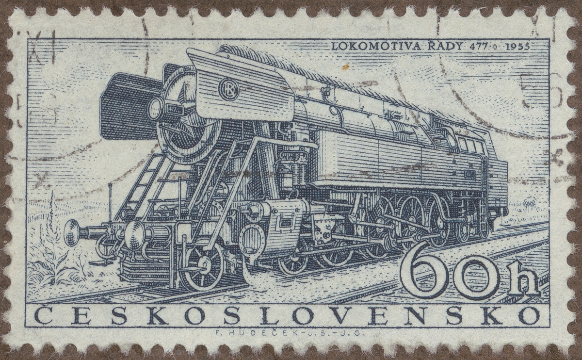 Frimärken ur Gösta Bodmans filatelistiska motivsamling, påbörjad 1950. Frimärke från Tjeckoslovakien, 1956. Motiv av Ångloket "Rady 477" av år 1955.