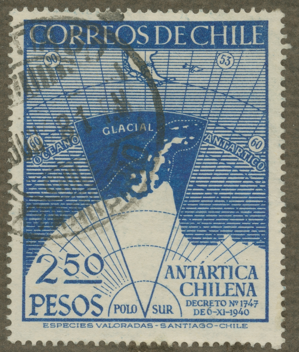Frimärke från Chile, 1947. Motiv av karta över Chiles pretention på sydpolarområdet 6.11.1940.