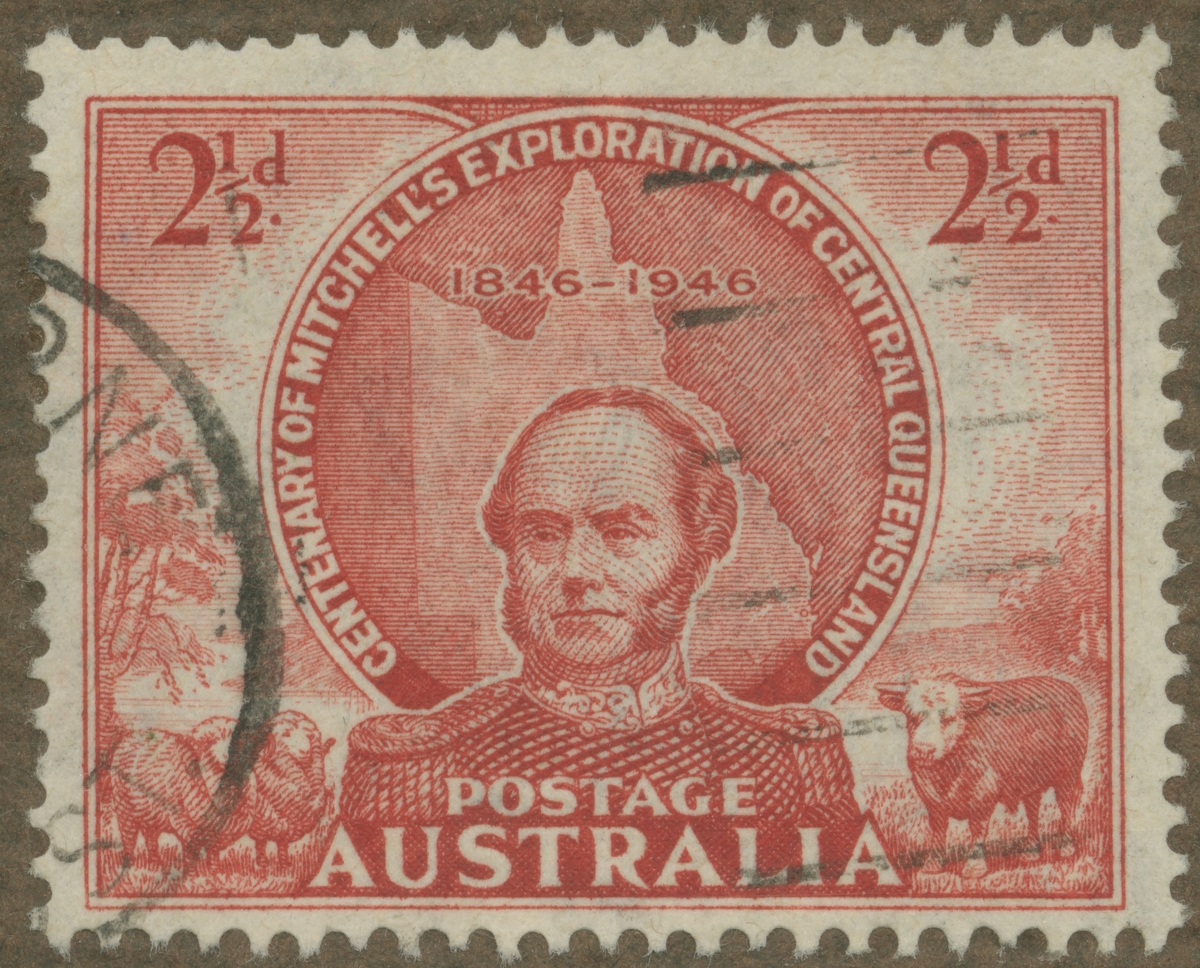 Frimärke från Australien, 1946. Motiv av karta över Queensland. Porträtt av Sir Thomas Mitchell. "100-årsminne av Mitchells utforskning av centrala Queensland 1846-1946".