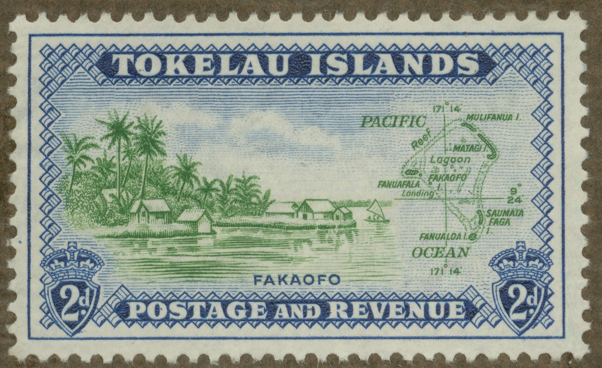 Frimärke från Tokelauöarna, 1948. Motiv av karta över Fakaofo.
