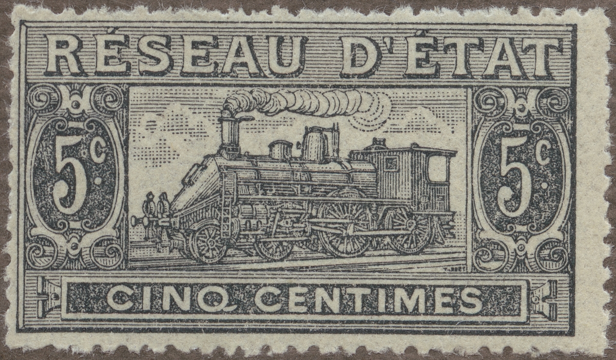Frimärken ur Gösta Bodmans filatelistiska motivsamling, påbörjad 1950. Frimärke från Frankrike, 1901. Motiv av Lokomotiv med 4 hjul-par "- Paketpostmärke.-"