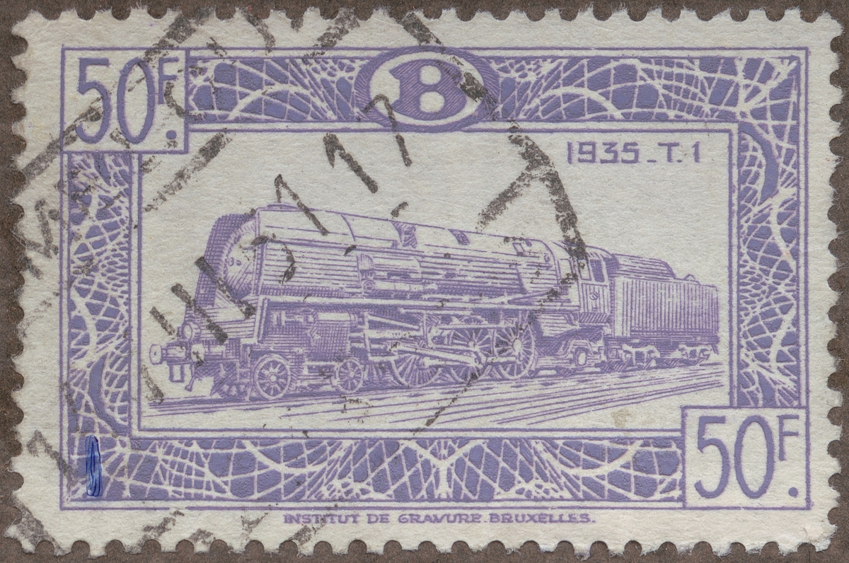 Frimärken ur Gösta Bodmans filatelistiska motivsamling, påbörjad 1950. Frimärke från Belgien, 1949. Motiv av Lokomotiv Belgien 1935 T 1