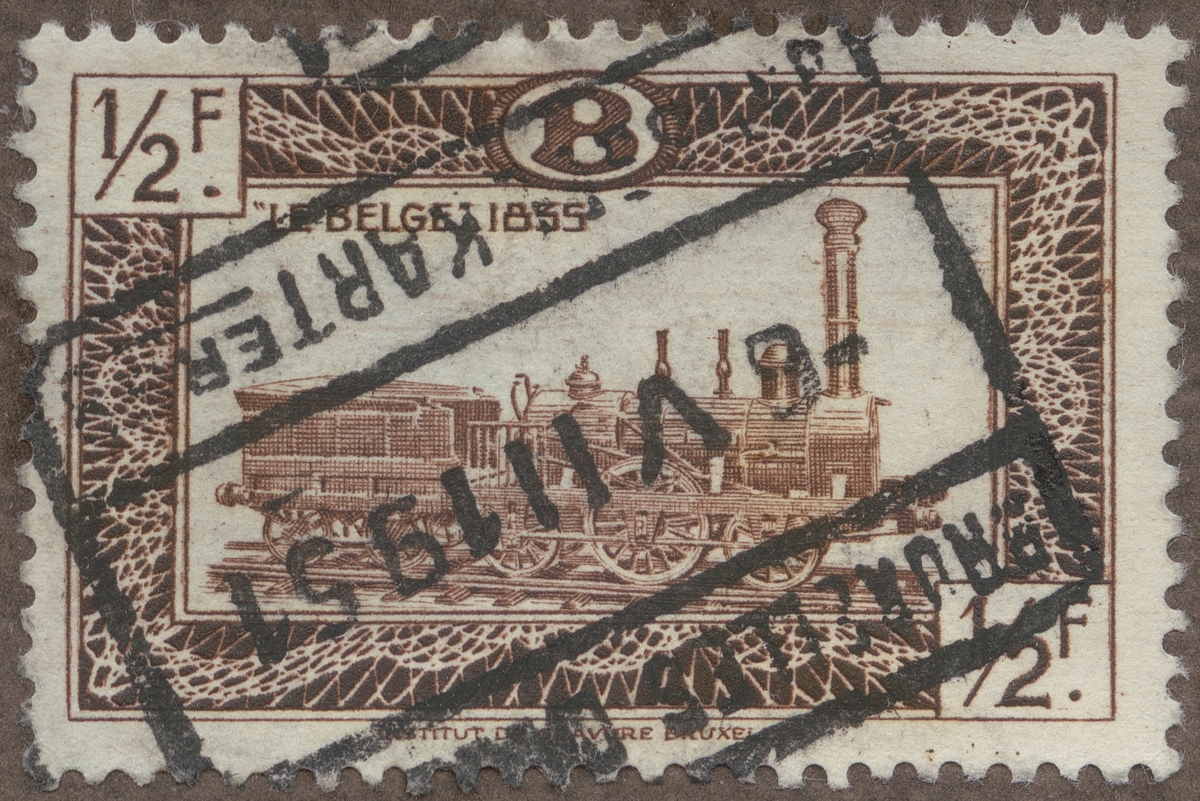 Frimärken ur Gösta Bodmans filatelistiska motivsamling, påbörjad 1950. Frimärke från Belgien, 1949. Motiv av Lokomotiv Belgien 1835