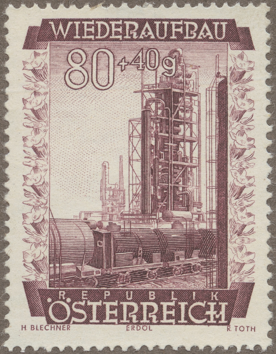 Frimärke från Österrike, 1948. Motiv av raffinaderi för bergolja.