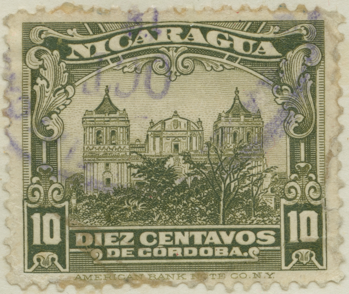 Frimärke från Nicaragua, 1914. Motiv av katedral i Léon.