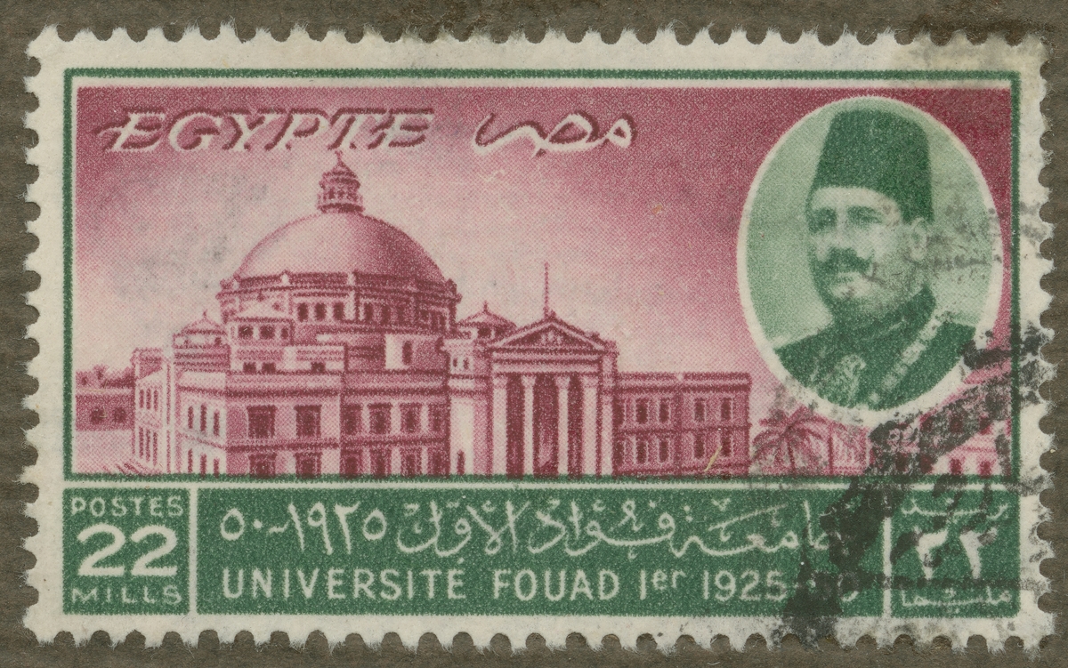 Frimärke från Egypten, 1950. Motiv av Fouad I:s Universitet, grundat 1925. "25-årsjubileum".