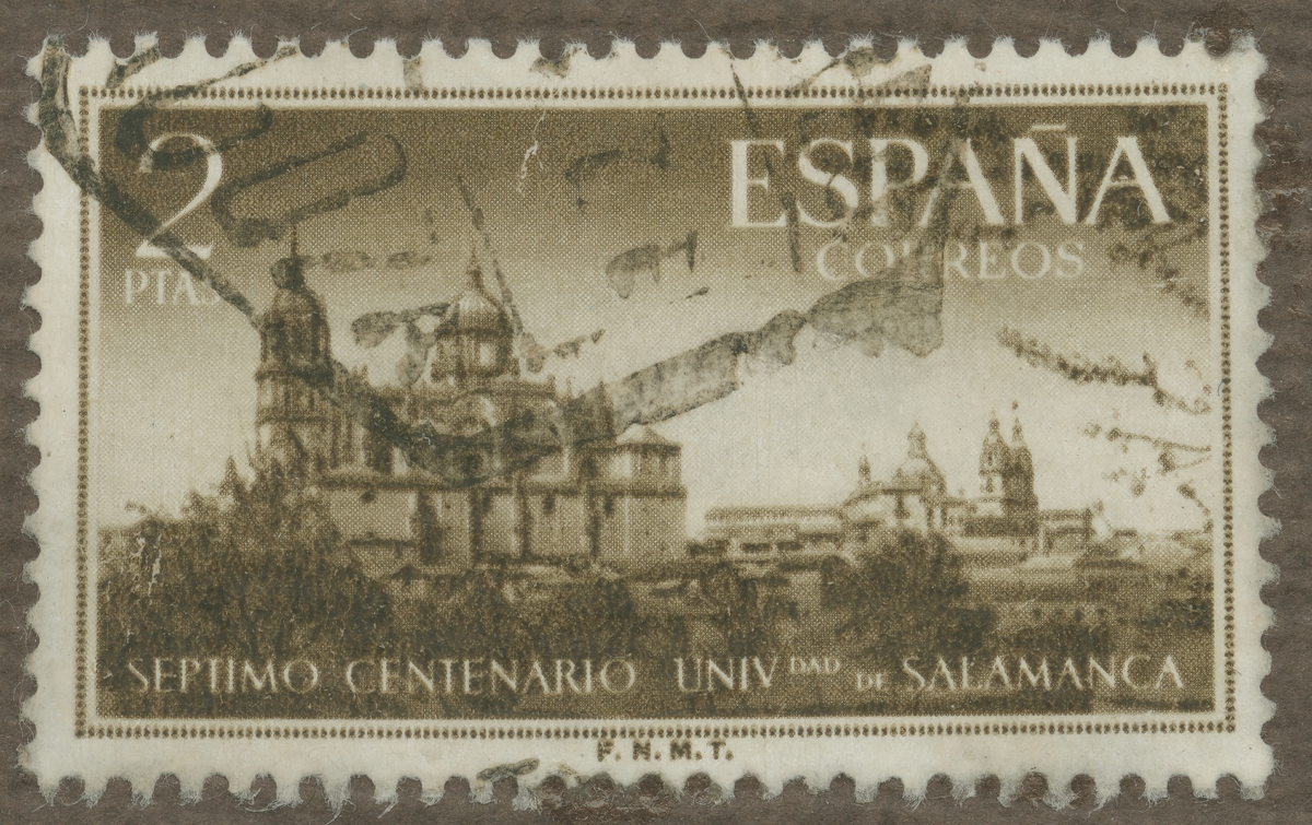 Frimärke från Spanien, 1953. Motiv av Universitetet i Salamanca, grundat 1230. "700-årsminne".