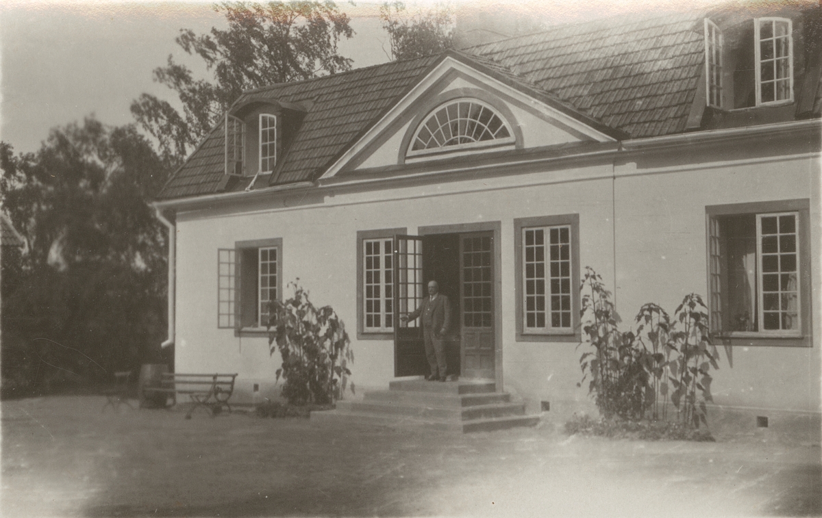 Fotografi från expedition till Spetsbergen. Motiv av man som står i dörröppningen till ett stort hus.