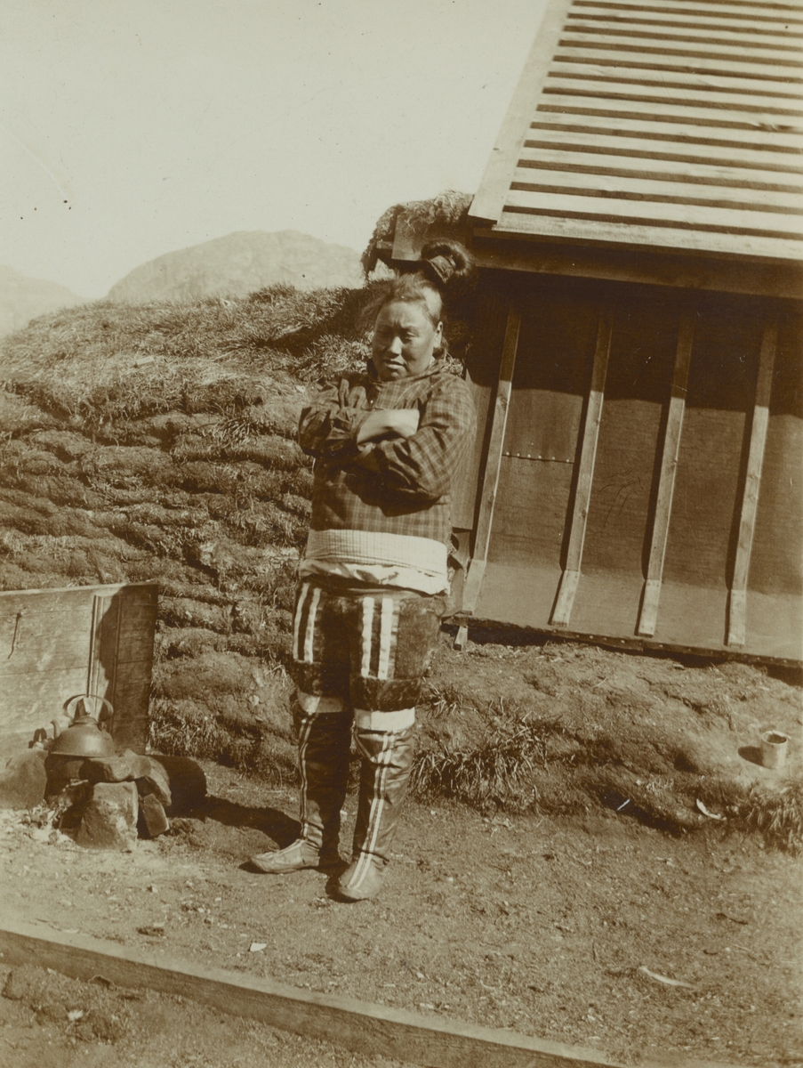 Fotografi från expedition till Grönland. Motiv av kvinna som står med armarna i kors framför ett hus.