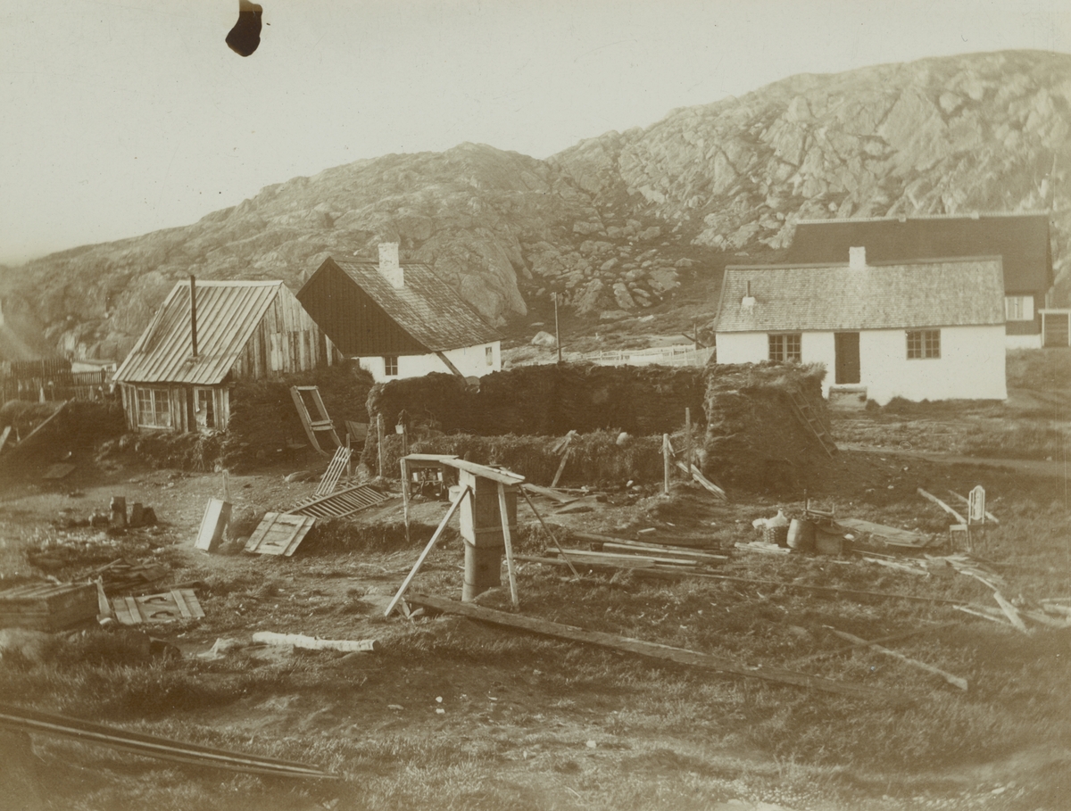 Fotografi från expedition till Grönland. Motiv av fyra hus nedanför ett berg.