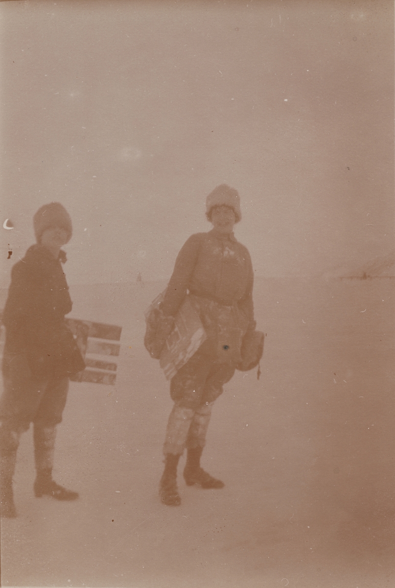 Fotografi från expedition till Spetsbergen. Motiv av två pojkar som åker släde i ett snölandskap.