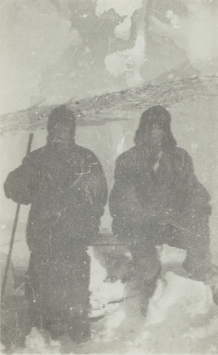 Fotografi från expedition till Spetsbergen. Motiv av två vinterklädda män som sitter och vilar i ett snölandskap.