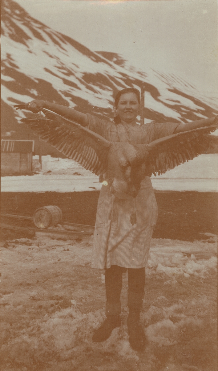 Fotografi från expedition till Spetsbergen. Motiv av kvinna som håller upp en stor död fågel i vingspetsarna.