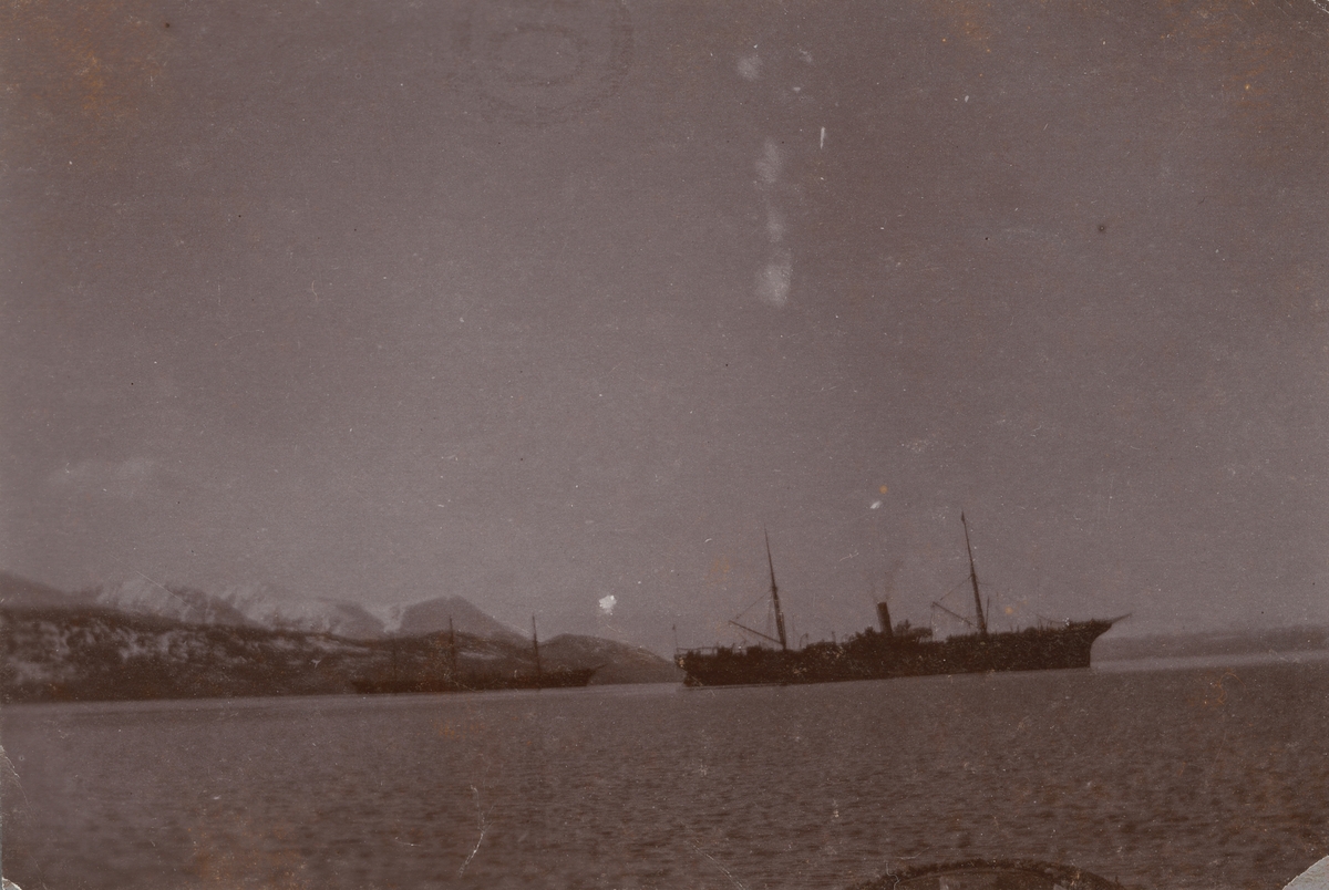 Fotografi från första svenska Antarktisexpeditionen 1901-1904. Vy över hav, fartyg och berg.