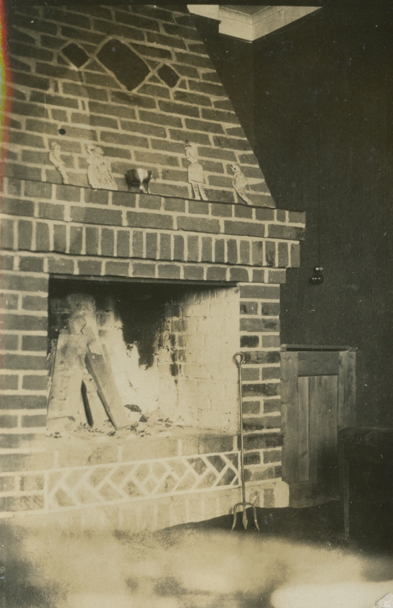Fotografi från expedition till Spetsbergen. Motiv av eldstad med brinnande ved i. Eldstaden är tillverkad av tegel.