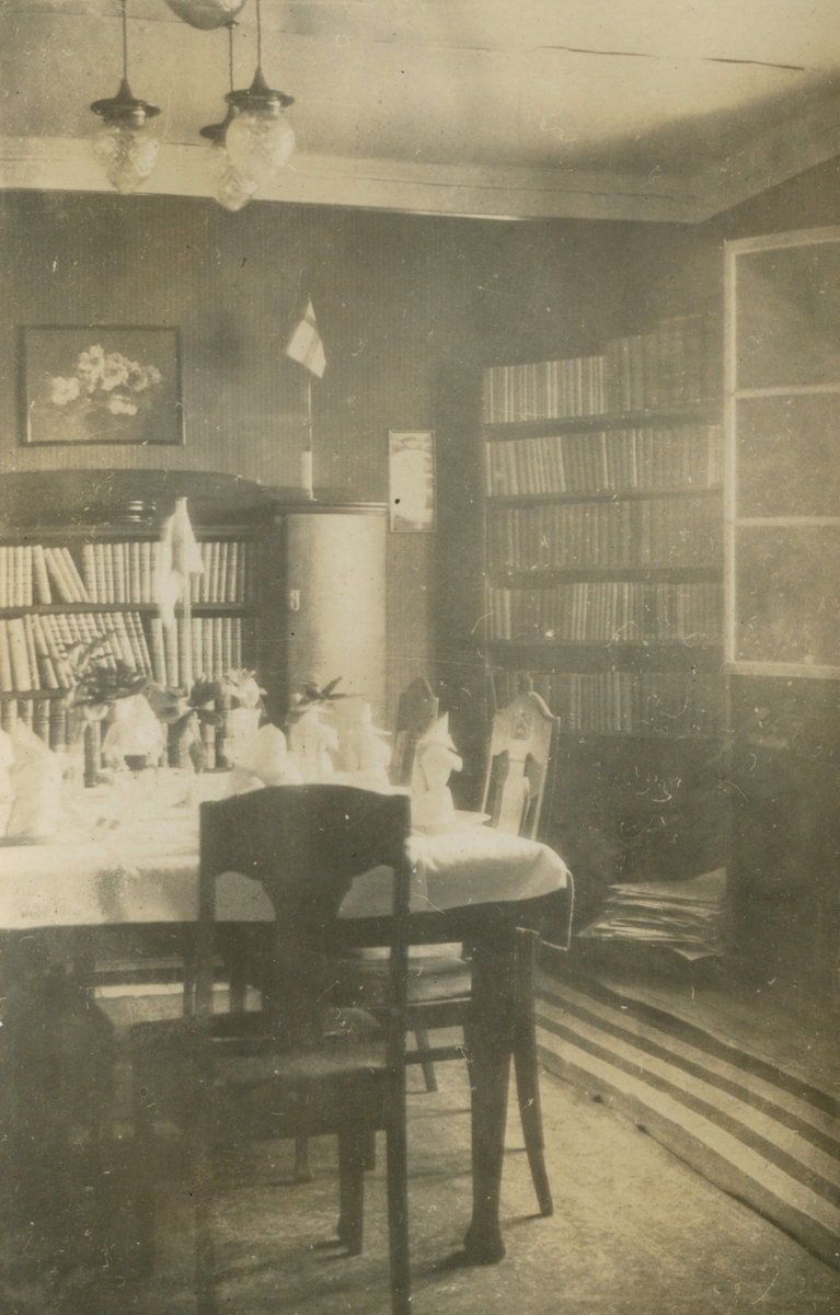 Fotografi från expedition till Spetsbergen. Motiv av vardagsrum med findukat bord. I rummet finns två bokhyllor, en tavla och en taklampa.