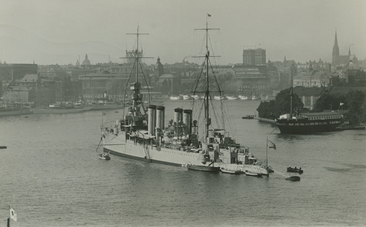 Lättkryssaren USS Raleigh på Stockholmsbesök omkring den 20 juli 1929. Till höger ligger före detta ångfregatten Vanadis som logementsfartyg. Fotografi från låda märkt Bernt Balchen. Balchen var norsk-amerikansk flygare, polarforskare och militär.