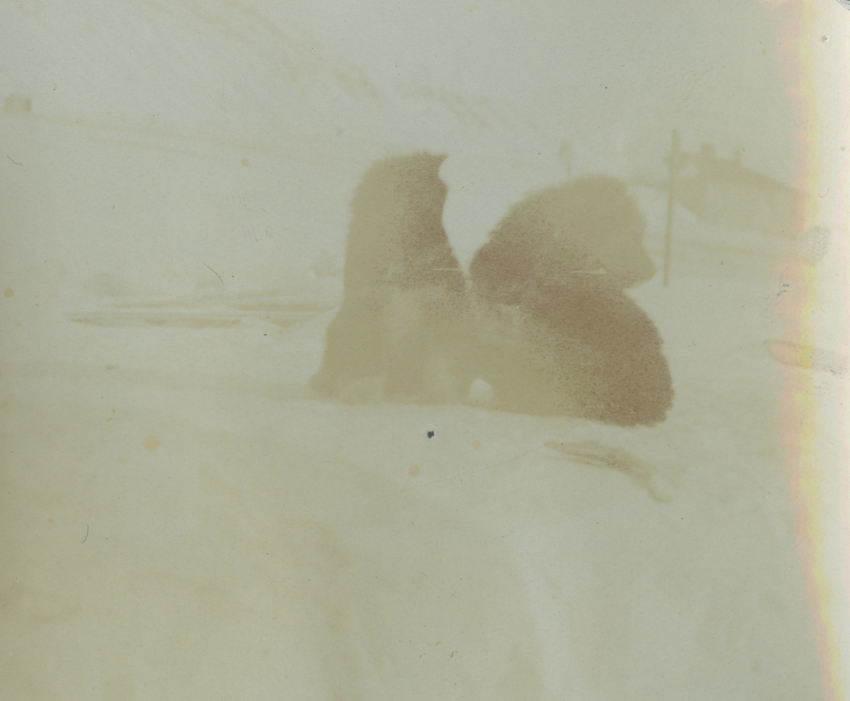 Fotografi från expedition till Spetsbergen. Motiv av två hundar som sitter nära varandra i ett snölandskap.