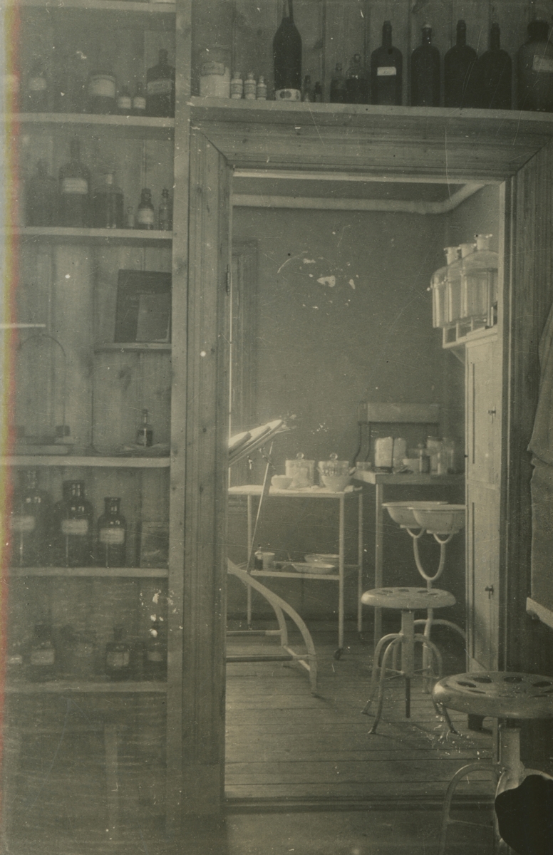 Fotografi från expedition till Spetsbergen. Motiv av vad som ser ut att vara en läkarmottagning. På hyllor syns flaskor i olika storlek och en våg. Det finns även pallar, kärl och man ser skymten av en brits.