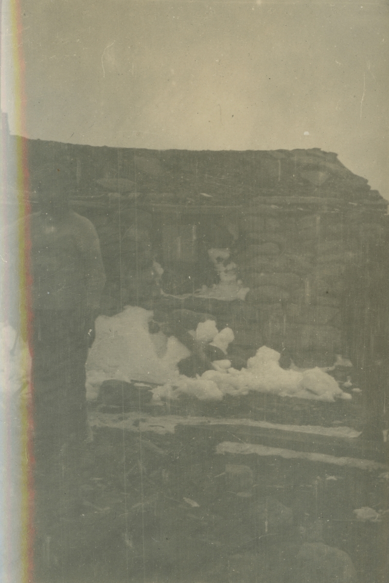 Fotografi från expedition till Spetsbergen. Motiv av pojke som står framför ett stenhus.