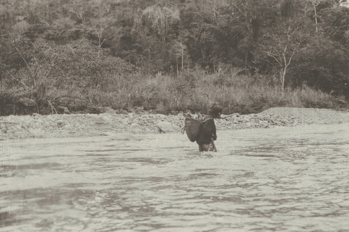 Fotografi från kuvert märkt med "Ernst Nordenskjöld". Motiv av man med packning på ryggen som vadar över flod i djungel.