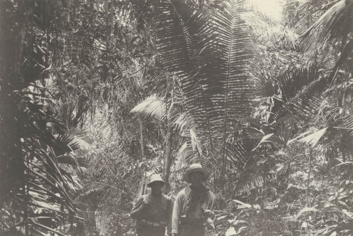 Fotografi från kuvert märkt med "Ernst Nordenskjöld". Motiv av två expeditionsdeltagare i djungel.