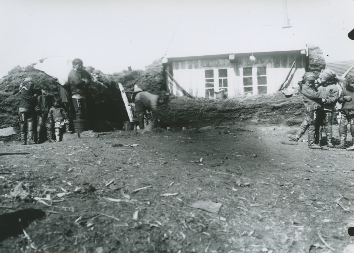 Fotografi från expedition till Grönland. Motiv av ett antal personer som står framför ett litet hus.