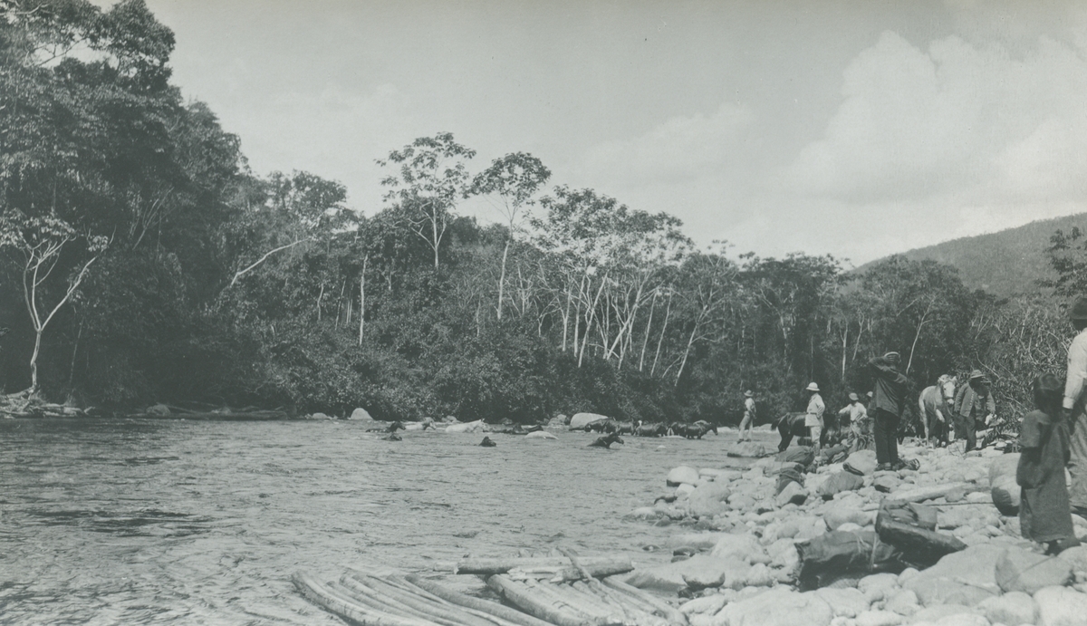 Fotografi från expedition till Peru 1920. Motiv av expeditionsdeltagare som står vid flod i djungeln.