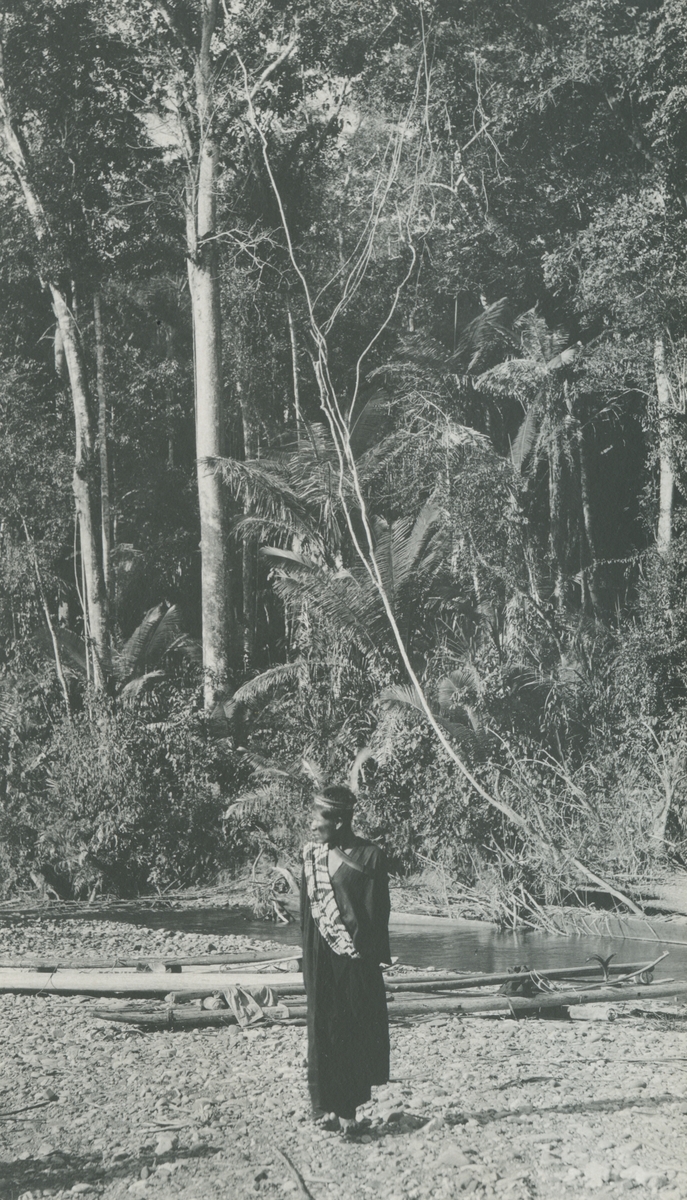 Fotografi från expedition till Peru 1920. Motiv av man som poserar i djungeln.