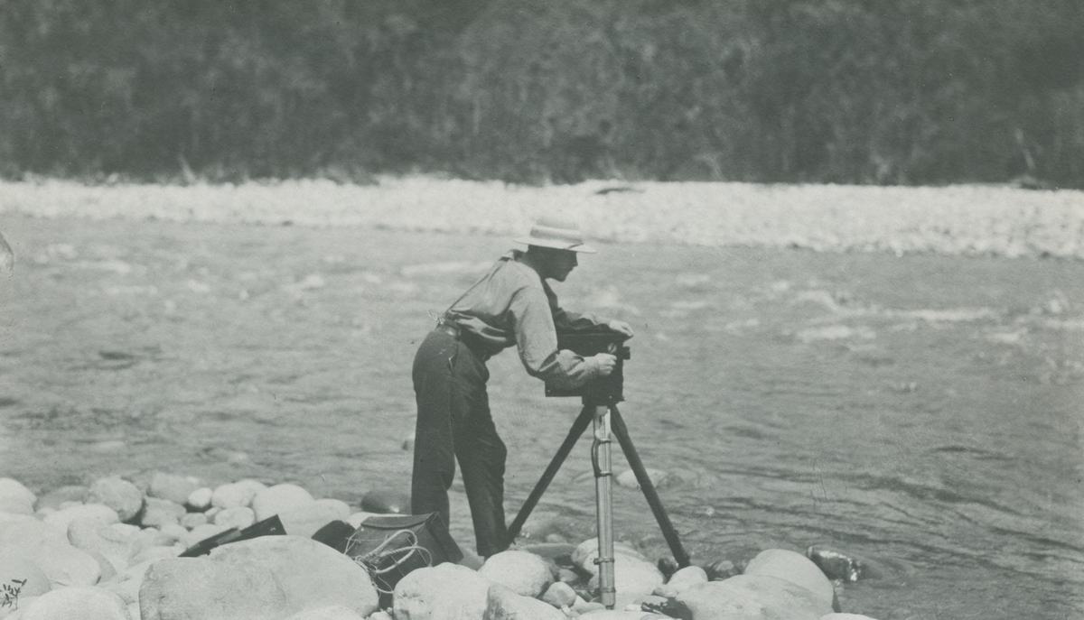Fotografi från expedition till Peru 1920. Motiv av expeditionsdeltagare med kamera på flodstrand i djungeln.