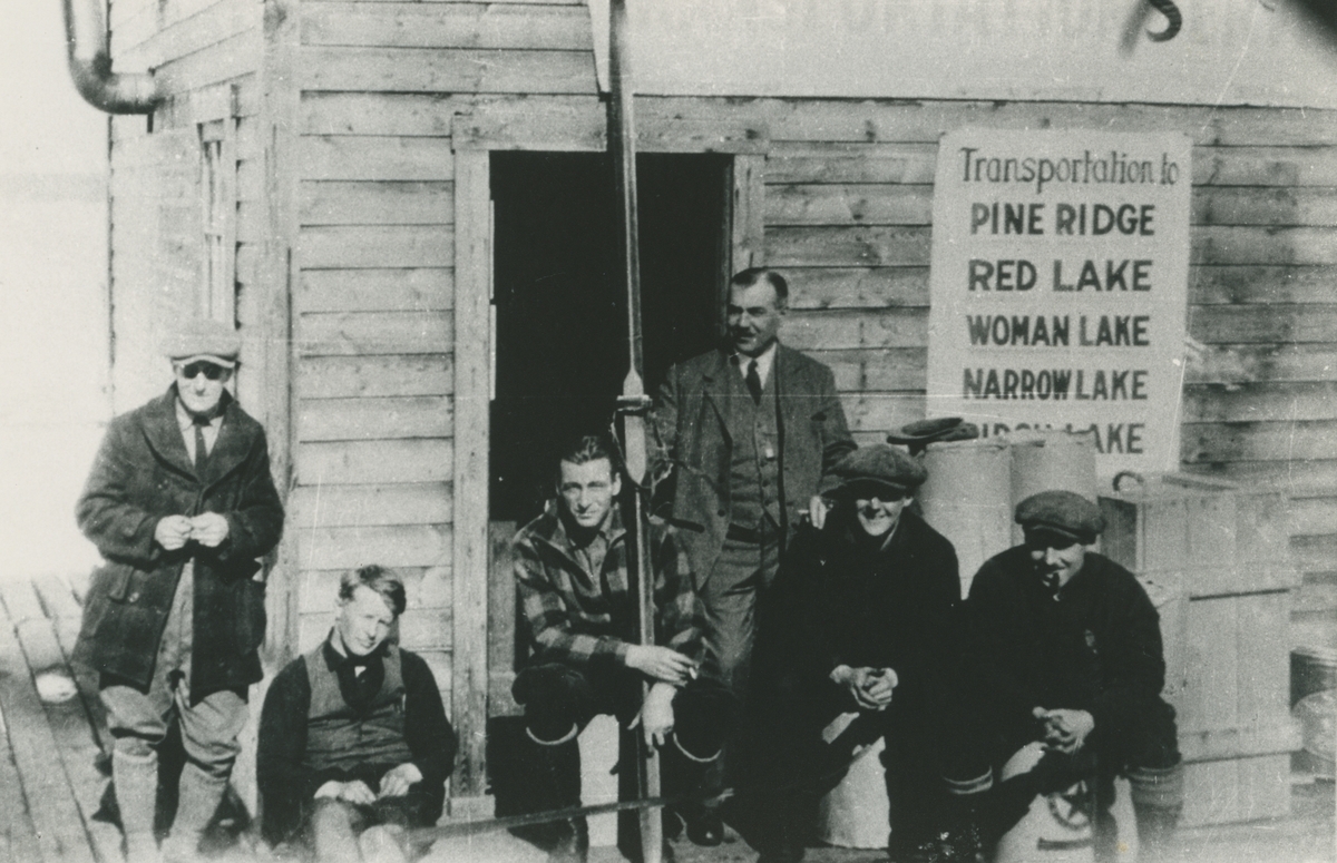 Fotografi från låda märkt Bernt Balchen. Balchen var norsk-amerikansk flygare, polarforskare och militär. Motiv av sex män som sitter utanför liten träbyggnad i Ontario, 1927.