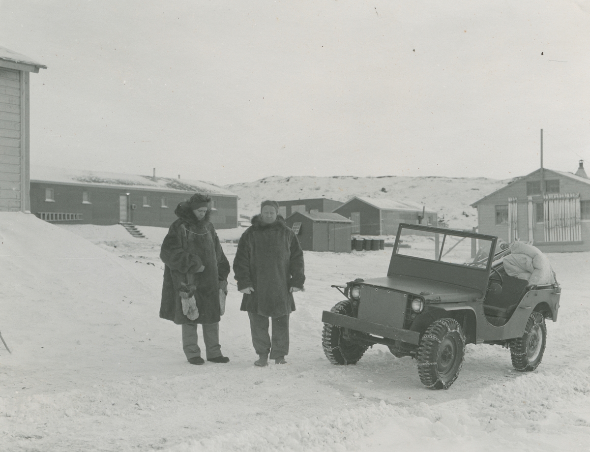 Fotografi från låda märkt Bernt Balchen. Balchen var norsk-amerikansk flygare, polarforskare och militär. Motiv av två vinterklädda män i snön vid jeep framför hus.