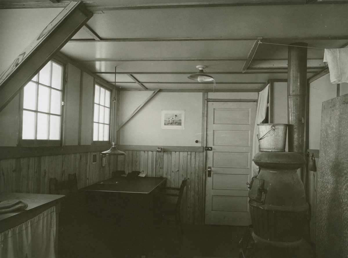 Fotografi från låda märkt Bernt Balchen. Balchen var norsk-amerikansk flygare, polarforskare och militär. Interiörbild från litet hus med kamin, spann, matbord och stolar.