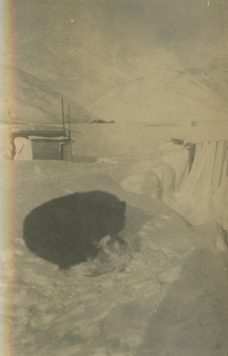 Fotografi från expedition till Spetsbergen. Motiv av hund med svart päls som vilar i ett snölandskap.