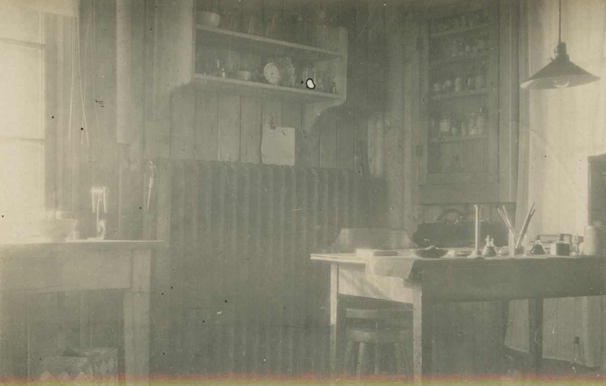 Fotografi från expedition till Spetsbergen. Interiörbild från trähus med motiv av rum med två bord, varav ett skrivbord, element hyllor med diverse små flaskor, taklampa och fönster.