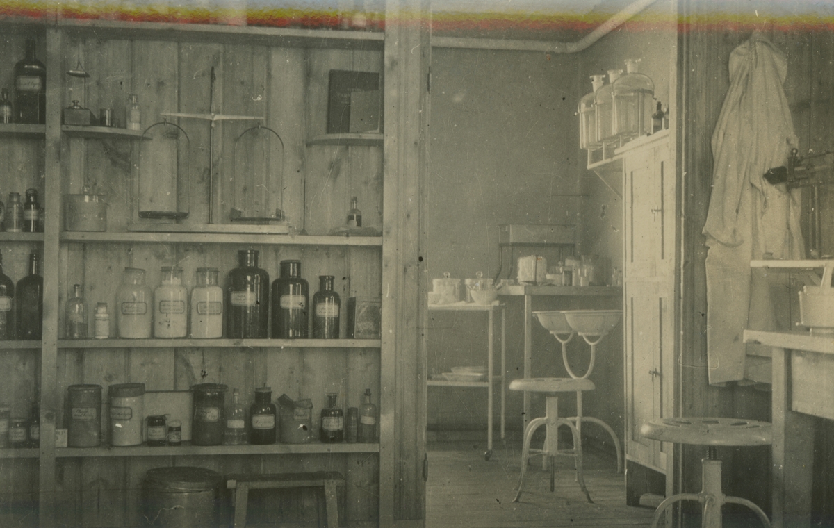 Titel: Fotografi från expedition till Spetsbergen. Motiv av vad ser ut att vara en läkarmottagning. På en hylla står många flaskor med olika innehåll och en våg. En vit rock hänger på väggen och det finns olika slags kärl ch pallar.