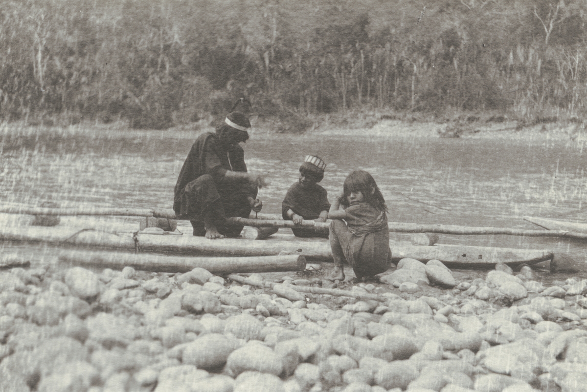Fotografi från kuvert märkt med "Ernst Nordenskjöld". Motiv av man med två barn som sitter vid kanot på strand i djungeln.