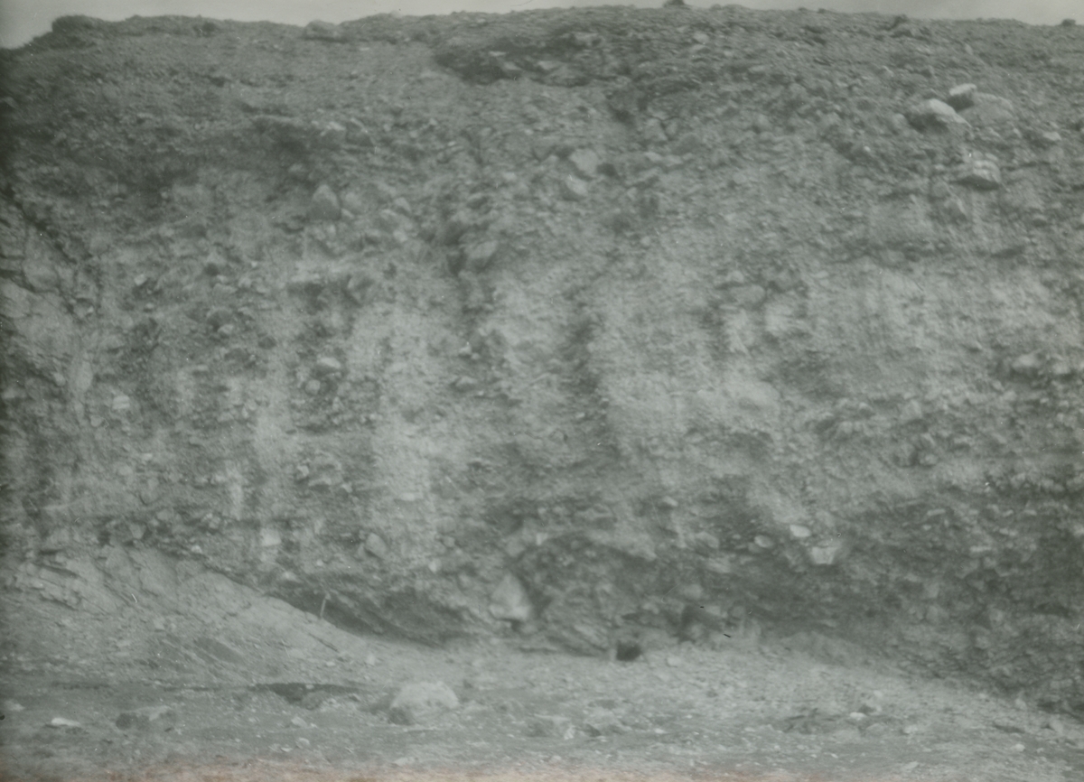 Fotografi från expedition till Östgrönland 1929. Dansk-svensk expedition under ledning av Lauge Koch. Svenska deltagare: Oscar Kulling och Helge Backlund. Närbild av stenig klippvägg.