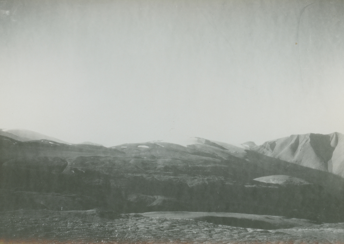 Fotografi från expedition till Östgrönland 1929. Dansk-svensk expedition under ledning av Lauge Koch. Svenska deltagare: Oscar Kulling och Helge Backlund. Vy över bergslandskap.