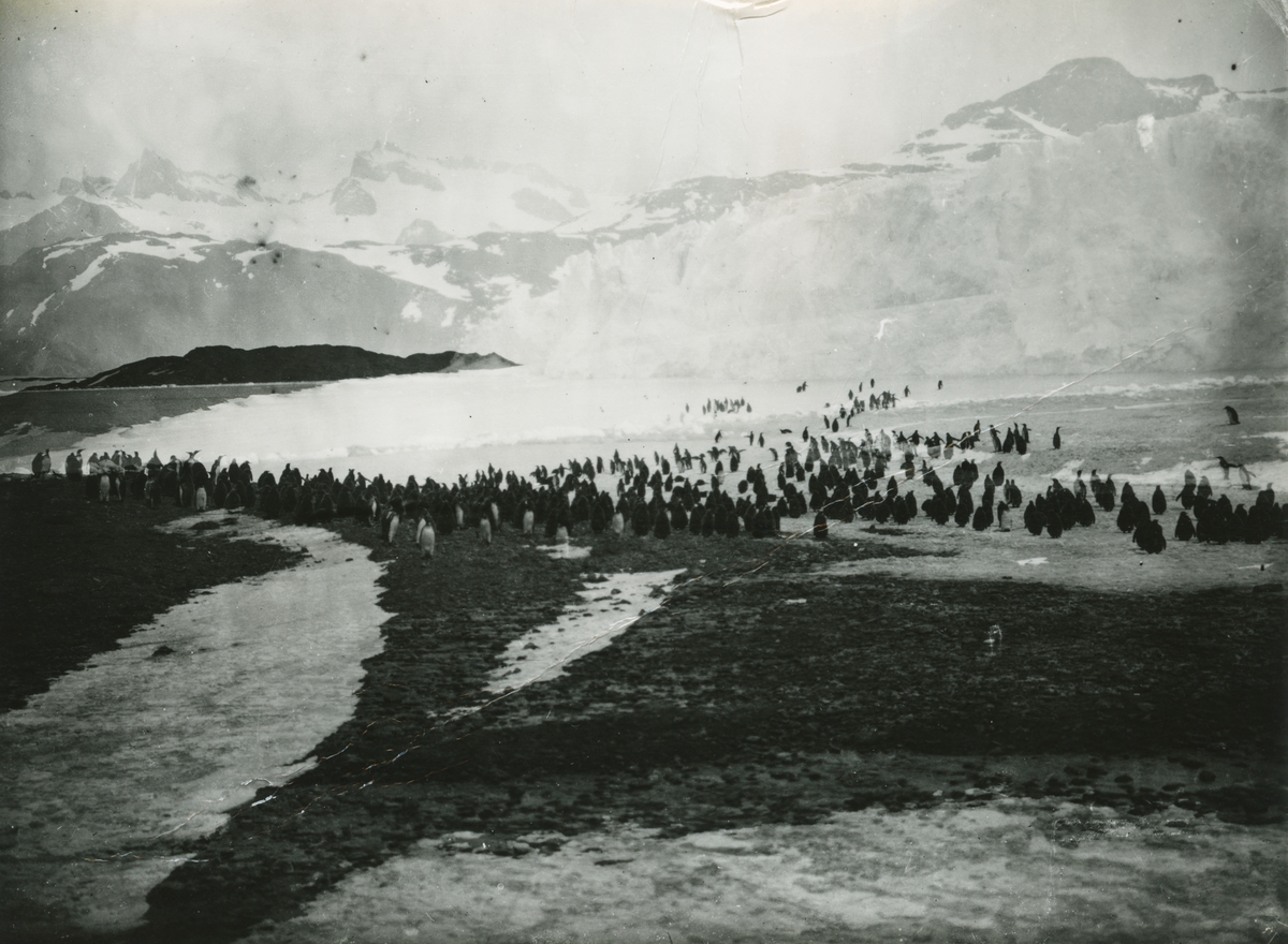 Bild från expedition i Antarktisområdet. Motiv av stor pingvinflock och berg.