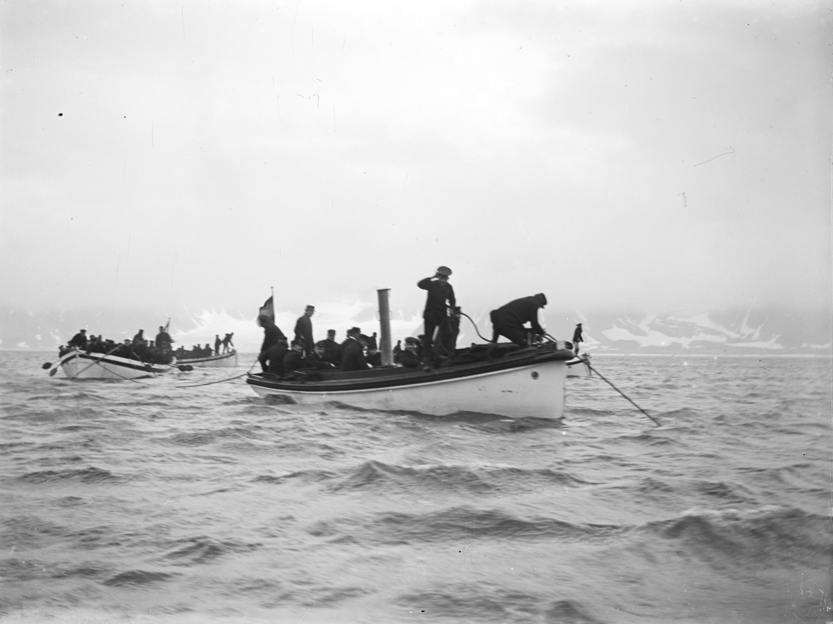 Fotografi från Spetsbergen. Motiv av män i båtar.
